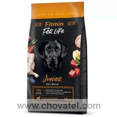 Krmivo pro juniory Fitmin dog For Life Junior představuje tradiční krmivo v prémiové kvalitě, které uspokojí jak chutě, tak vyváženou stravu štěňat velkých a obřích plemen v období 5 – 18 měsíců věku. Mladý pes neskotačí o nic míň než štěně, přičemž nároky na jeho výživu se mění, proto potřebuje speciální krmivo, které individuální požadavky plně uspokojí. Zcela zásadní je kontrolovaný obsah energie pro zdravý vývoj kostry a podpora výživy kloubů přídavky glukosaminu a chondroitin sulfátu.