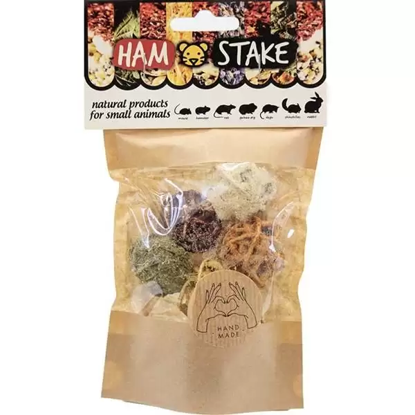 Malé křupavé grain free ratanové kuličky Ham-Stake se šesti různými příchutěmi jsou jedinečným mixem neodolatelných vůní, chutí i barev a opravdovým gurmánským požitkem pro vaše hlodavce. Každá ze šesti kuliček je obalená jinou sušenou zeleninou nebo bylinkou: od rajčete přes červenou řepu, pastinák, petržel, brokolici až po měsíček. A co víc: kuličky jsou nejen zdravým a chutným pamlskem, ale zároveň i zábavnou interaktivní hračkou, se kterou se váš malý kamarád nebude nikdy nudit. Voňavá a lahodná pochoutka ho podněcuje k aktivitě, stimuluje jeho přirozený hlodací instinkt a tím podporuje zdraví zubů. Obsahuje řadu vitamínů, minerálů a dalších zdraví prospěšných látek. Vysoké množství vlákniny podporuje správné trávení.