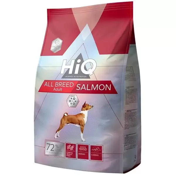 Kompletní krmivo HiQ pro dospělé psy všech plemen s lososem obsahuje vysoce kvalitní bílkoviny z lososa, které zajišťují zachování lesku a hustoty srsti a zároveň podporují zdraví pokožky. Neobsahuje pšenici a kukuřici, proto je vhodný pro psy s citlivým zažíváním nebo trpící nesnášenlivostí lepku. Krmivo napomáhá snadnému trávení a vstřebávání živin. Podporuje zdraví kostí a kloubů a dodává potřebné vitamíny a minerály. Pečuje o správné fungování srdeční činnosti a také o imunitu psa.