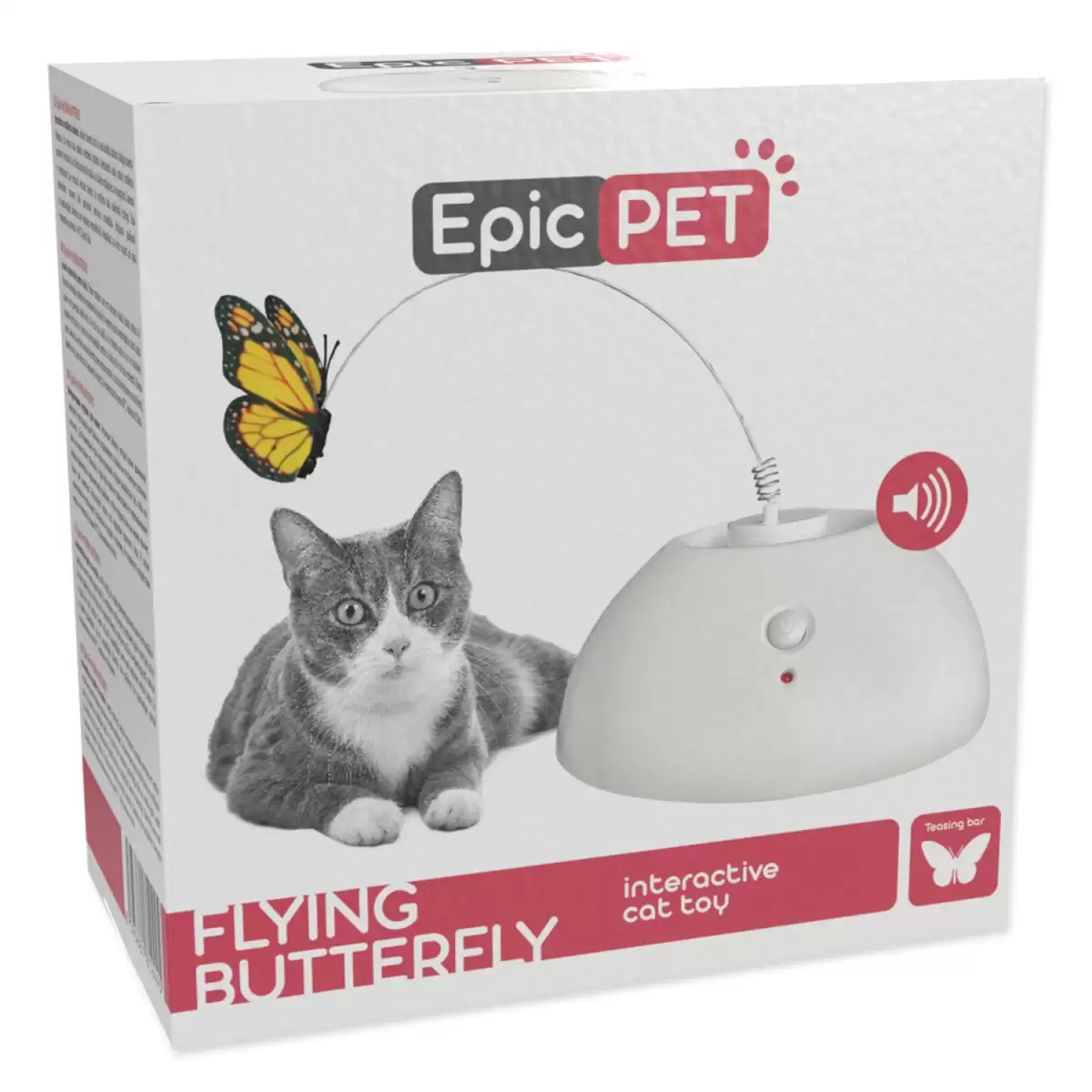 Interaktivní hračka pro kočky. Motýlek je připevněn k nerezovému drátu pro větší odolnost hračky.