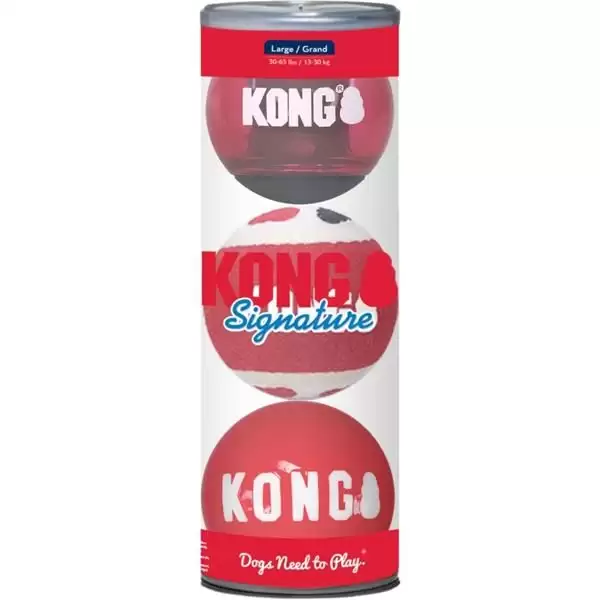 Míčky KONG Signature Ball vynikají odolností a vysokým odskokem díky speciální gumě, z níž jsou vyrobeny. Pružný, a přitom houževnatý materiál dobře odolává psím zubům. Zároveň je k zubům a dásním velmi šetrný – stejně jako jemná tenisová plsť, kterou KONG používá. Pro ještě větší vzrušení ze hry mají v sobě některé míčky zabudované pískátko.