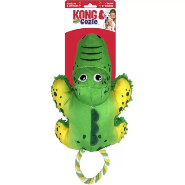 Hračka pro psy KONG Cozie Tuggz Gator je roztomilý barevný aligátor s provazovou rukojetí – smyčkou ze silného bavlněného lana, jehož konce vytvářejí uzel vnořený do aligátořího těla. Po skousnutí vydává hračka pískavé zvuky. Břicho a vnitřní stranu končetin pokrývá hebký a měkký plyš, zatímco ostatní části jsou vyrobeny z látky. Hračka dokonale uspokojují přirozené psí instinkty a zabaví na dlouhé hodiny. Konstrukčně je uzpůsobena k přetahování, díky vyztužené plyši a silné a pevné látce odolá i zuřivému třepání a lomcování, náruživému okusování i obyčejnému mazlení. Pískání upoutá zájem vašeho psa a povzbudí ho k další hře. Hračku lze snadno přenášet v tlamě a její měkké tělo je příjemné na okusování a šetrné k zubům i dásním. Velikost M/L je vhodná pro psy středních a velkých plemen.