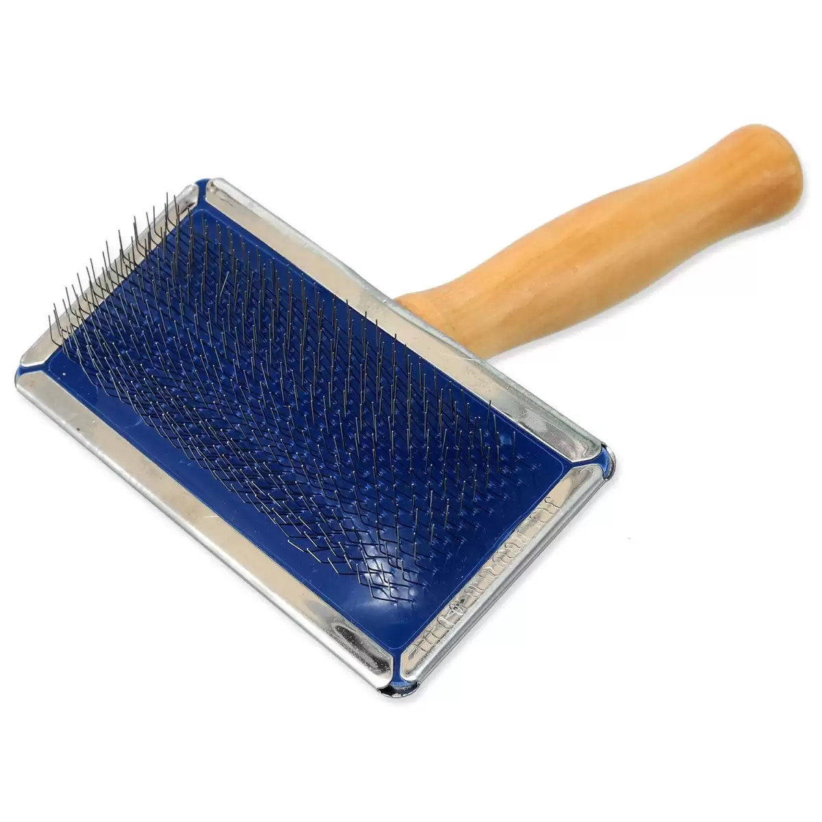 Jednostranný kartáč s příjemně tvarovanou dřevěnou rukojetí a jemnými drátěnými štětinami. Pro všechna plemena psů.
