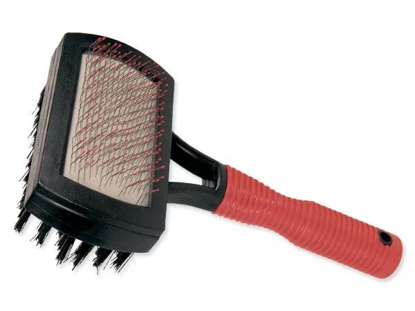 Oboustranný kartáč s gumovou rukojetí, kovovými drátky a nylonem na vyčesávání línajících chlupů. Velikost: 10 x 17 cm.