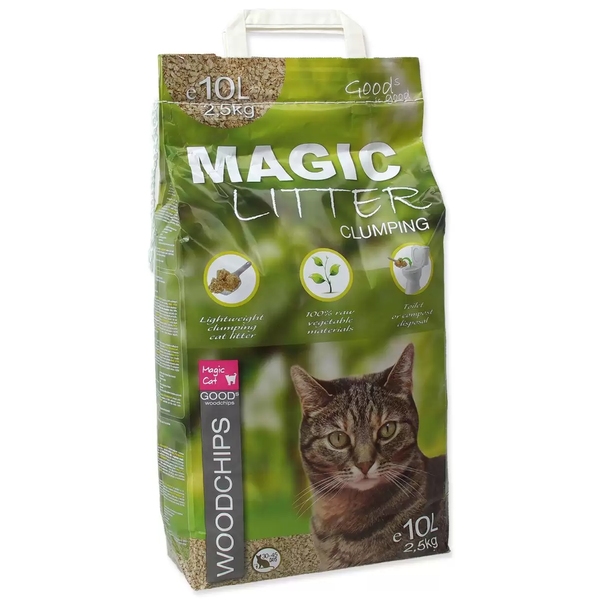 Podestýlka MAGIC LITTER PELLETS je vyrobena ze 100% přírodních rostlinných surovin, které jsou kompostovatelné a 100% biologicky rozložitelné. Použitou podestýlku můžete likvidovat podobně jako toaletní papír v běžné domácí toaletě. Díky podestýlce MAGIC LITTER PELLETS tak ušetříte za drahou likvidaci odpadů. Respektujte, prosím, místní předpisy pro likvidaci odpadů.