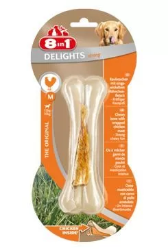 Extra pevné žvýkací kostičky 8in1 Delights Strong dlouho vydrží. Kuřecí maso je zabalené do velmi tvrdé prémiové surové kůže, která podporuje dentální péči. Pamlsky pro psy Delights S jsou vhodné pro menší a střední psy. Pravidelné žvýkání eliminuje tvorbu zubního plaku a kamene.