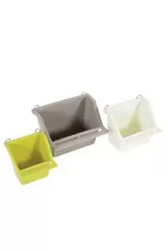 Závěsné plastové krmítko do klece je opatřeno bidýlkem, je vyrobeno ve třech přírodních barvách.