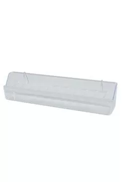 Transparentní krmítko s dělící mřížkou na zavěšení do klece pro ptáky.