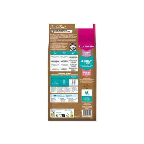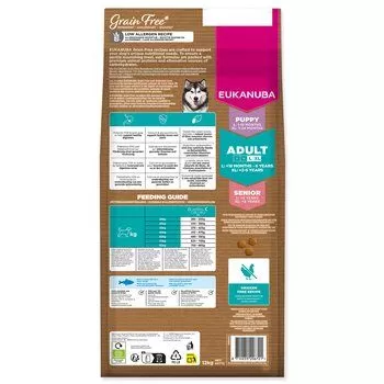 EUKANUBA Grain Free receptura pro dospělé psy velkých plemen je pečlivě sestavená tak, aby krmivo neobsahovalo běžné alergeny. Batáty a hrách jako zdroj vlákniny, vitamínů a antioxidantů.