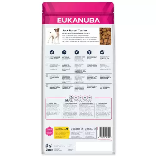 Jack Russell teriéři jsou malí, kompaktní atletičtí psi, hraví a plní energie, ale zároveň nebojácní a obdivovaní pro svou nezávislost a odvahu. Jsou velmi aktivní a budou šťastní, když budou mít dostatek prostoru k běhu, lovu a hře. Podobně jako psi jiných malých plemen mohou být náchylní k problémům s chrupem. Proto mohou využívat výhod na míru přizpůsobené výživy. Krmivo Eukanuba Jack Russell teriér je kompletní a vyvážená denní strava určená k podpoře aktivního životního stylu, podpoře pohyblivosti kloubů a zdravé tlamičky těchto psů.
