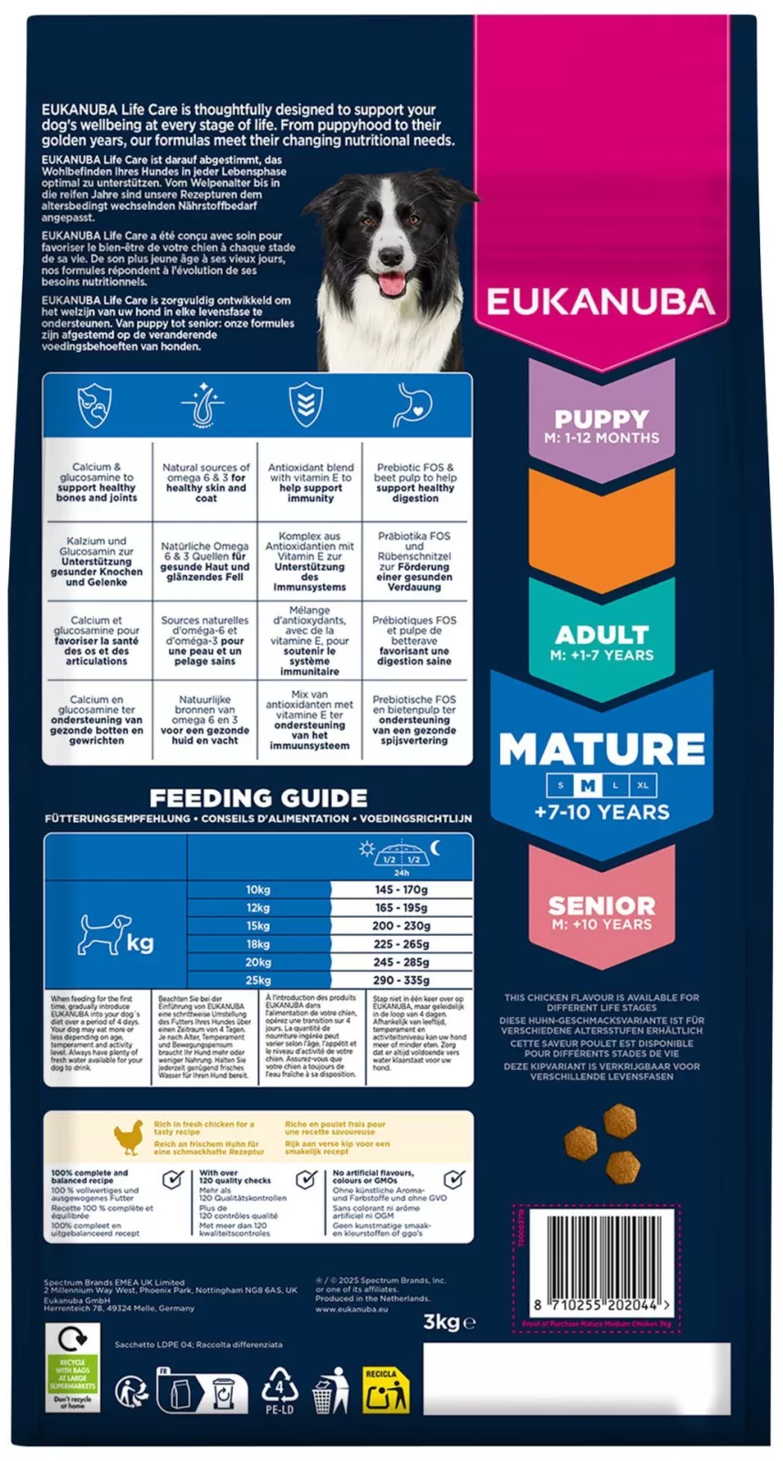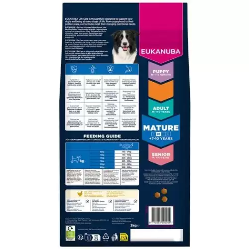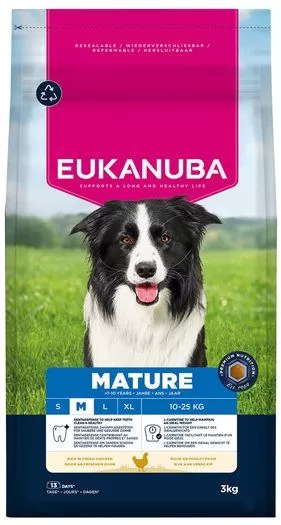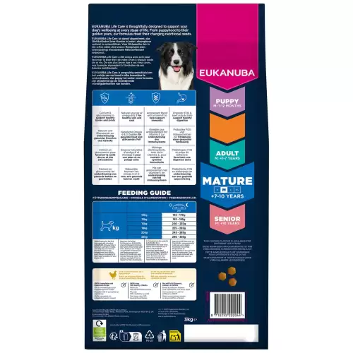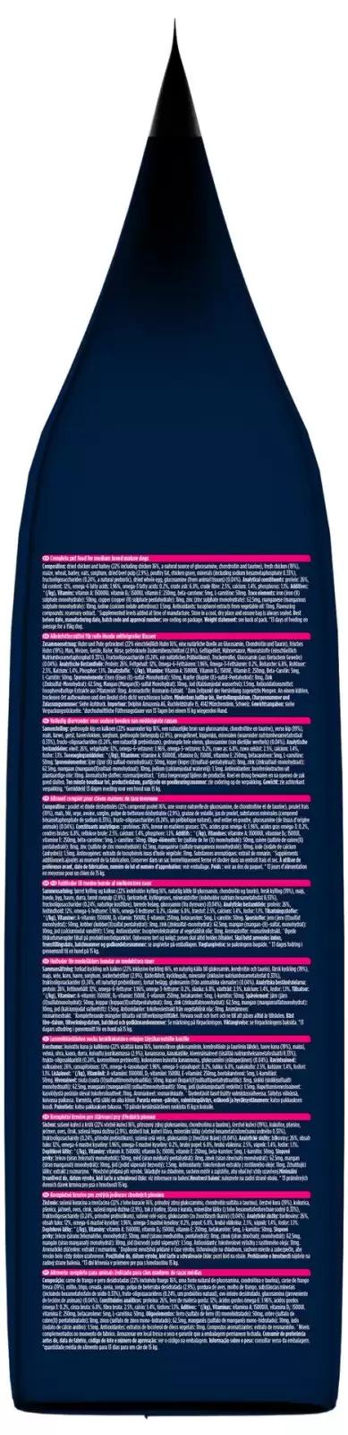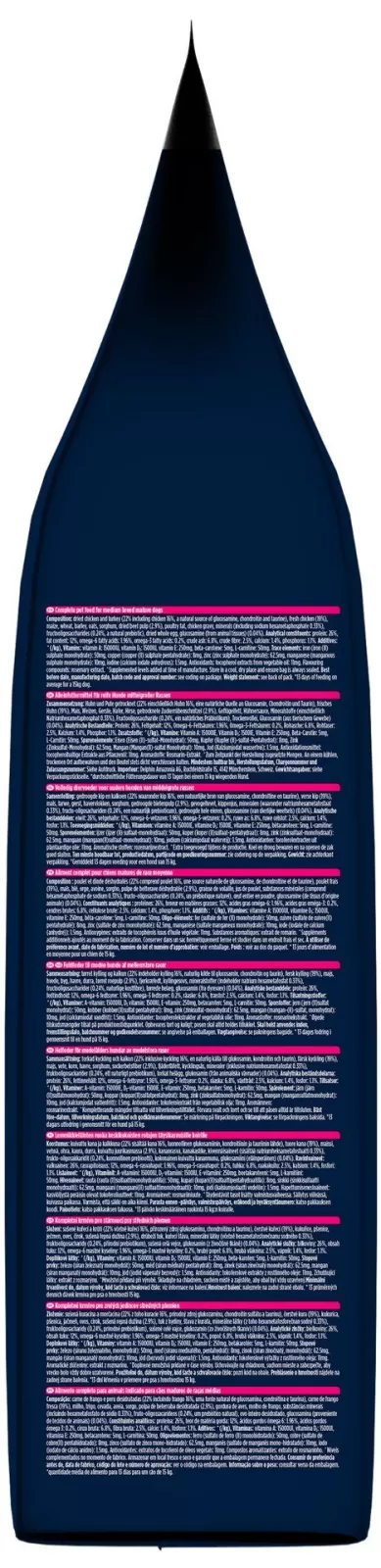 Složení: | Sušené kuřecí a krůtí (22 % – včetně kuřecí 16 %, přirozený zdroj glukosaminu, chondroitinu a taurinu), čerstvé kuřecí (19 %), ječmen, kukuřice, pšenice, drůbeží tuk, oves, čirok, sušená řepná dužina (2,9 %), kuřecí šťáva, minerální látky (včetně hexametafosforečnanu sodného 0,33 %), fruktooligosacharidy (0,24 %, přírodní prebiotikum), sušená celá vejce, glukosamin (z živočišné tkáně) (0,04 %). |