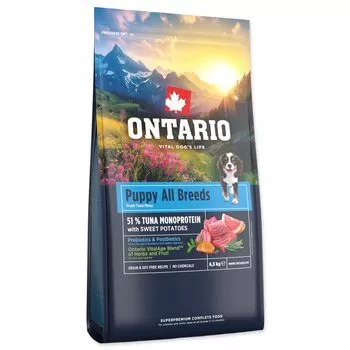 Dozvědět se více Ontario Puppy&Junior pro všechna plemena Monoproteinová receptura s tuňákem a batáty Chutné krmivo s jediným živočišným proteinem – kvalitním tuňákem je ideální volbou pro štěňata s? Extrakt z grepu Obsahuje naringin, přírodní polyfenol, který pomáhá chránit buňky před oxidací.