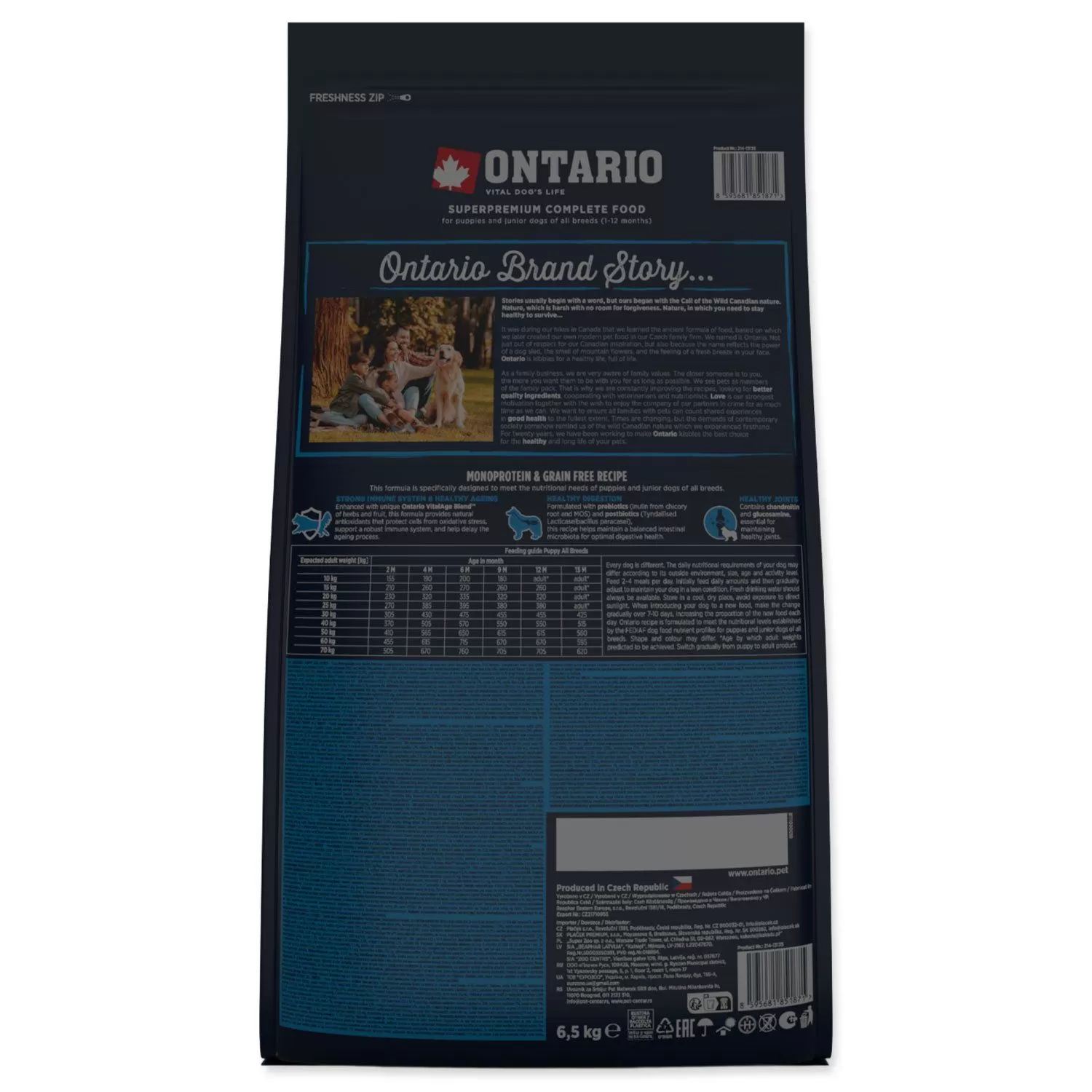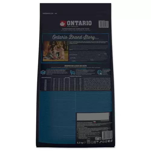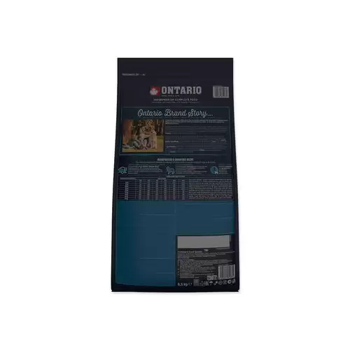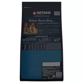 Ontario receptura je navržena tak, aby splnila nutriční požadavky štěňat a junior psy všech plemen, předepsané evropskou federací FEDIAF. Tvar a barva každé granule se může nepatrně lišit. Skladujte na chladném a suchém místě, bez přímého slunečního záření. Vyrobeno v České republice.