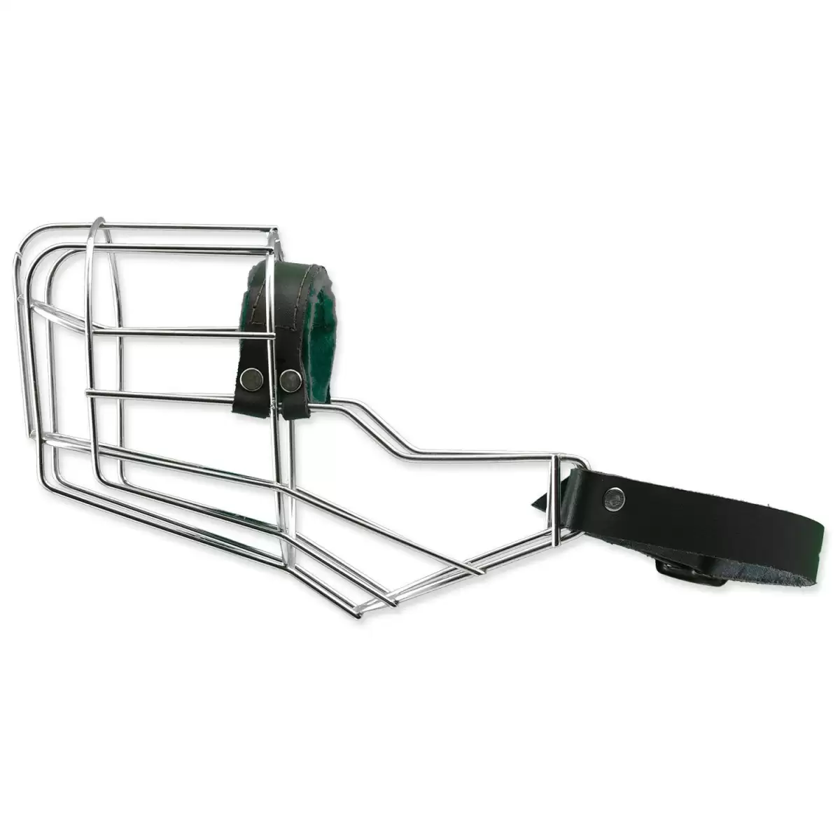 Kovový náhubek s koženými řemínky na zapínání pro jezevčíka.