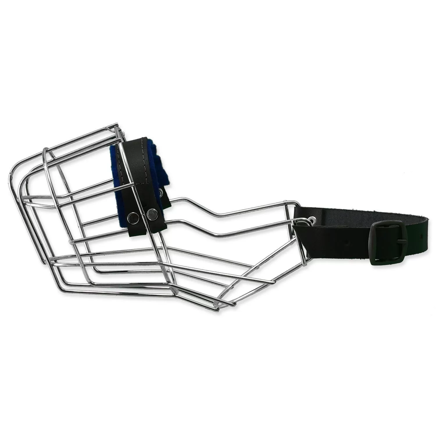 Kovový náhubek s koženými řemínky na zapínání. Vhodný pro fenu kokršpaněla.