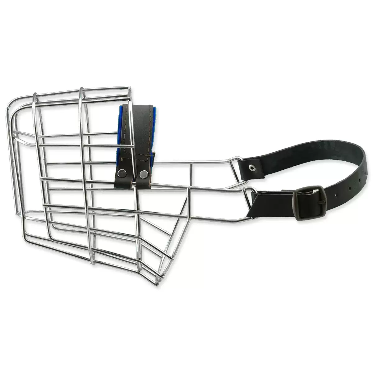 Kovový náhubek s koženými řemínky na zapínání pro kolii.