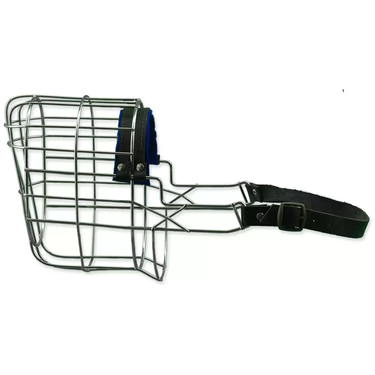 Kovový náhubek s koženými řemínky na zapínání pro rotweilera.