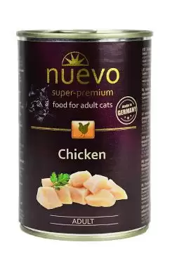Konzervou Nuevo kočka adult Kuře potěšíte každou vybíravou kočičku a dopřeje jí tak nezapomenutelný gurmánský zážitek. Konzerva je bohatá na vysoký podíl kvalitního masa (71%) s velkým množstvím cenných bílkovin je odpovědí na individuální potřeby citlivé kočky – pouze čerstvé maso obohacené o esenciální vitamíny a minerály. Výborný zdroj energie, výborně stravitelná a obzvláště chutná strava.
