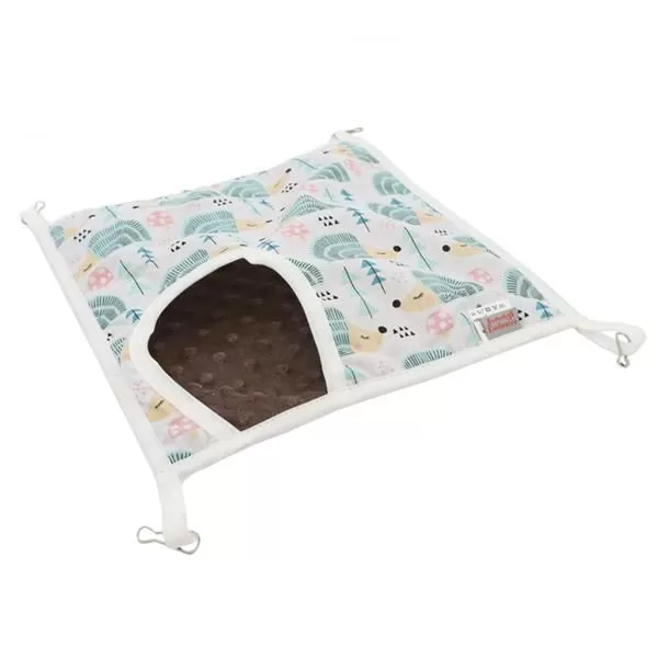 Pelech dr.savec s vchodem, ježci na bílé, hnědá minky 30x30cm Pohodlný závěsný pelíšek střední velikosti pro chvíle bezpečného odpočinku a zábavy drobných savců. Hamaka je ušitá ze dvou vrstev látky: na vnitřní stranu byla použita měkká a hřejivá minky hnědé barvy, vnější strana je bavlněná s motivem ježků. V rozích jsou všitá poutka opatřená karabinkami pro snadné zavěšení v kleci. Vyrobeno v České republice. Rozměry (cca): 30 × 30 cm Materiál: vnější strana – 100% bavlna vnitřní strana – 100% polyester (minky) Údržba: ruční praní do 30 °C