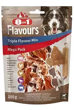 Doplňkové krmivo pro dospělé psy, pochoutky 8in1 Triple Flavour výběr: špízy, žebra a křídla z vepřové a hovězí kůže, obalené lahodnými kuřecími prsy. Špízy obsahují také kachní prsa a kuřecí játra.