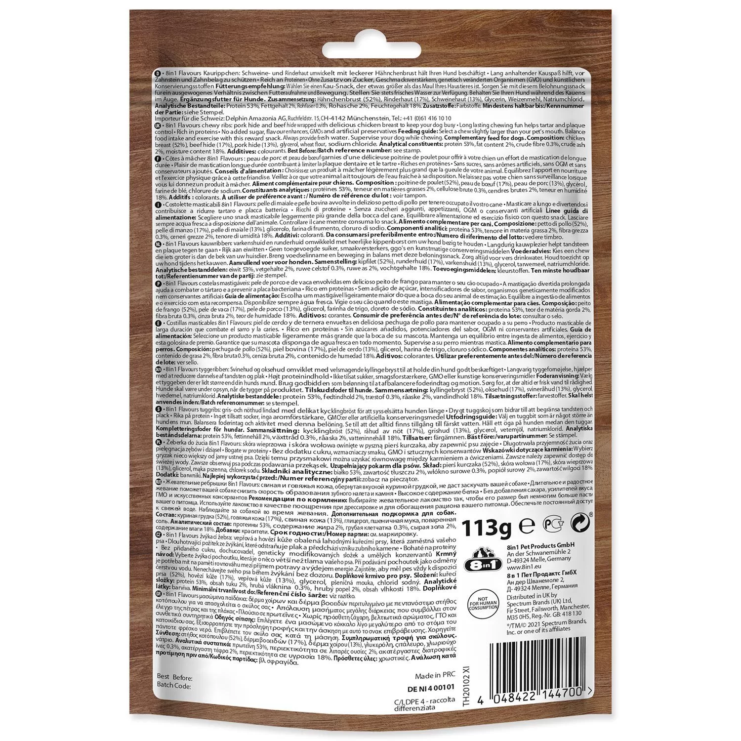 Kuřecí prsa (52 %), hovězí kůže (17 %), vepřová kůže (13 %), glycerol, pšeničná mouka, chlorid sodný.