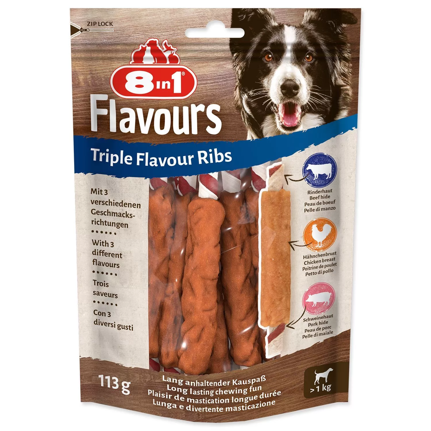 Lahodná třívrstvá pochoutka s velkými kusy chutného kuřecího masa v kombinaci s vepřovou a hovězí kůží.