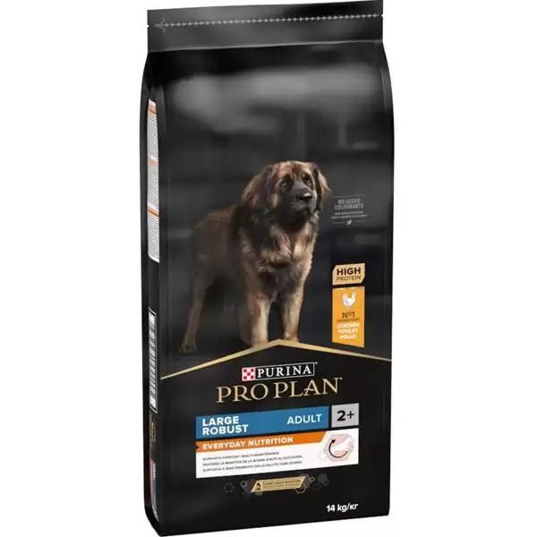 Krmivo Purina PRO PLAN® Everyday Nutrition LARGE ADULT ROBUST bylo vyvinuto pro dospělé psy velkých, robustních plemen (s hmotností nad 25 kg). Granule obsahují vitamín D, minerální látky a specifické množství omega-3 mastných kyselin (0,3 %), které přispívají ke zdraví zubů a dásní. Krmivo má vysoký podíl kvalitního kuřecího, a tak zajišťuje optimální výživu velkých plemen od 24 měsíců až do 7 let věku. Následně byste měli přejít na produkty z řady Age Defence.