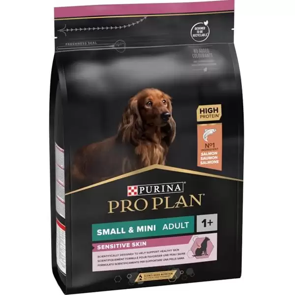 Krmivo Purina PRO PLAN® Sensitive Skin SMALL&MINI ADULT bylo vyvinuto pro dospělé psy malých a trpasličích plemen (s hmotností do 10 kg). Granule obsahují vitamín D, minerální látky a specifické množství omega-3 mastných kyselin (0,8 %), které přispívají ke zdraví zubů a dásní. Krmivo má vysoký podíl lososa, a tak zajišťuje optimální výživu malých a trpasličích plemen od 12 měsíců až do 9 let. Následně byste měli přejít na produkty z řady Age Defence.