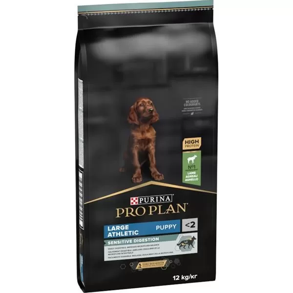 Krmivo Purina PRO PLAN® Sensitive Digestion LARGE PUPPY ATHLETIC bylo vyvinuto pro štěňata velkých sportovních plemen (s hmotností v dospělosti nad 25 kg). Granule pro štěňata obsahují vitamín D a minerální látky, které podporují silné a zdravé zuby. Krmivo má velký podíl vysoce kvalitního jehněčího, a tak zajišťuje optimální výživu štěňat velkých psů. To vše až do věku 24 měsíců, kdy přejdou na produkty řady ADULT.