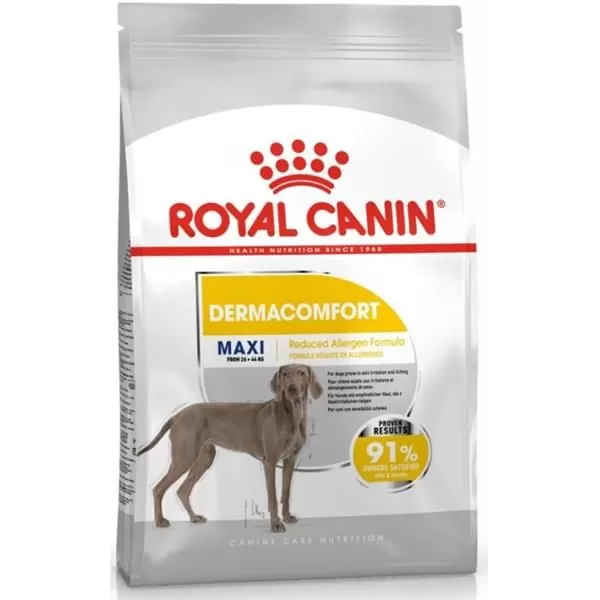ROYAL CANIN® Dermacomfort Maxi je krmivo upravené na míru s aktivními živinami, které podporují zdravou pokožku vašeho psa. Krmivo je obohaceno o mastné kyseliny omega 3 a omega 6 a pomáhá zklidnit pokožku, která je díky tomu méně citlivá na dráždivé látky v okolním prostředí. Tyto živiny také pomáhají udržovat srst vašeho psa zdravou. Granule pro psy ROYAL CANIN® Dermacomfort Maxi, vhodné pro psy s hmotností od 26 do 44 kg, obsahují speciálně navržené granule, které dokonale vyhovují zubům vašeho psa.